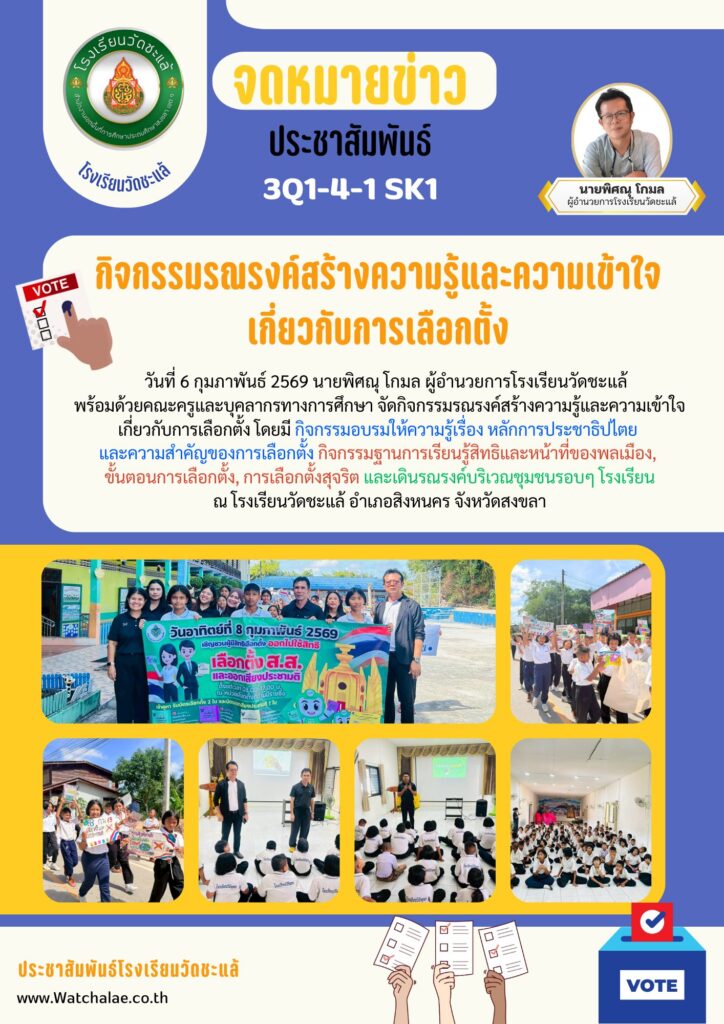 วันที่ 6 กุมภาพันธ์ 2569 นายพิศณุ โกมล ผู้อำนวยการโรงเรียนวัดชะแล้ พร้อมด้วยคณะครูและบุคลากรทางการศึกษา จัดกิจกรรมรณรงค์สร้างความรู้และความเข้าใจเกี่ยวกับการเลือกตั้ง โดยมี กิจกรรมอบรมให้ความรู้เรื่อง หลักการประชาธิปไตย และความสำคัญของการเลือกตั้ง กิจกรรมฐานการเรียนรู้สิทธิและหน้าที่ของพลเมือง, ขั้นตอนการเลือกตั้ง, การเลือกตั้งสุจริต และเดินรณรงค์บริเวณชุมชนรอบๆ โรงเรียน ณ โรงเรียนวัดชะแล้ อำเภอสิงหนคร จังหวัดสงขลา
