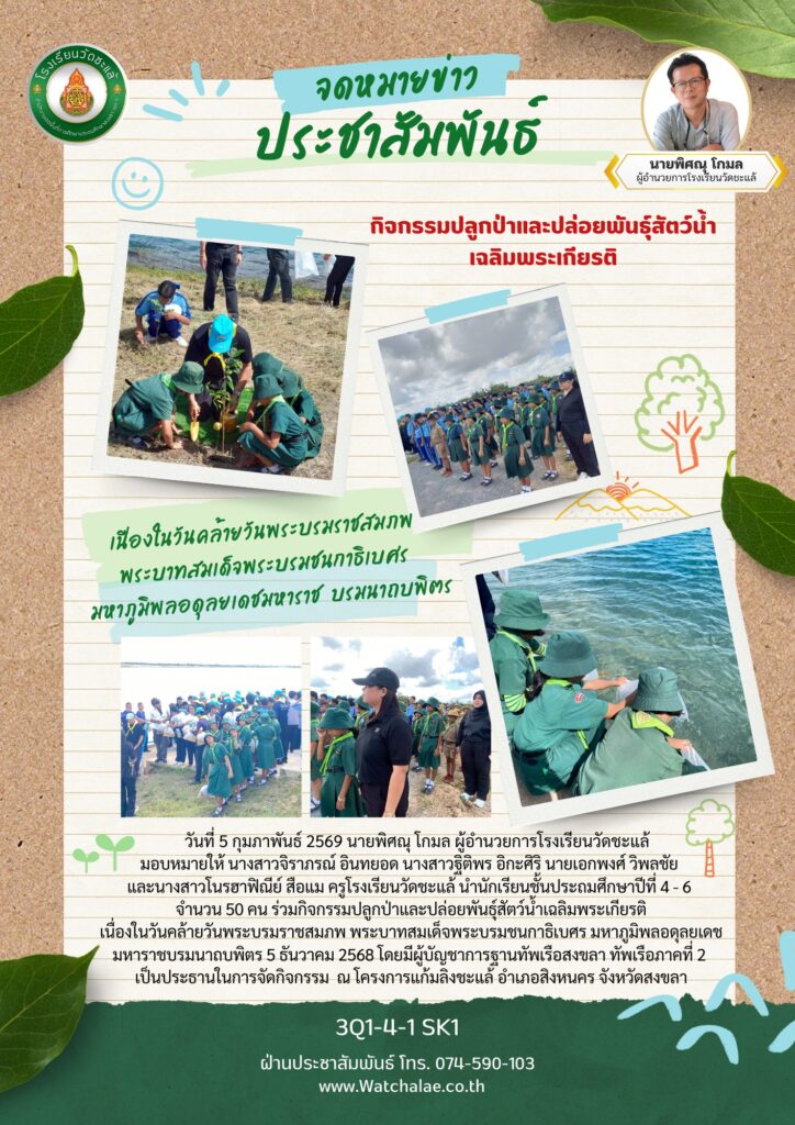 วันที่ 5 กุมภาพันธ์ 2569 นายพิศณุ โกมล ผู้อำนวยการโรงเรียนวัดชะแล้ มอบหมายให้ นางสาวจิราภรณ์ อินทยอด นางสาวฐิติพร อิกะศิริ นายเอกพงศ์ วิพลชัย และนางสาวโนรฮาฟิณีย์ สือแม ครูโรงเรียนวัดชะแล้ นำนักเรียนชั้นประถมศึกษาปีที่ 4 – 6 จำนวน 50 คน ร่วมกิจกรรมปลูกป่าและปล่อยพันธุ์สัตว์น้ำเฉลิมพระเกียรติ เนื่องในวันคล้ายวันพระบรมราชสมภพ พระบาทสมเด็จพระบรมชนกาธิเบศร มหาภูมิพลอดุลยเดชมหาราชบรมนาถบพิตร 5 ธันวาคม 2568 โดยมีผู้บัญชาการฐานทัพเรือสงขลา ทัพเรือภาคที่ 2 เป็นประธานในการจัดกิจกรรม ณ โครงการแก้มลิงชะแล้ อำเภอสิงหนคร จังหวัดสงขลา