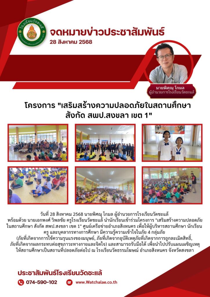 วันที่ 28 สิงหาคม 2568 นายพิศณุ โกมล ผู้อำนวยการโรงเรียนวัดชะแล้ พร้อมด้วย นายเอกพงศ์ วิพลชัย ครูโรงเรียนวัดชะแล้ นำนักเรียนเข้าร่วมโครงการ “เสริมสร้างความปลอดภัยในสถานศึกษา สังกัด สพป.สงขลา เขต 1” ศูนย์เครือข่ายอำเภอสิงหนคร เพื่อให้ผู้บริหารสถานศึกษา นักเรียน ครู และบุคลากรทางการศึกษา มีความรู้ความเข้าใจในภัย 4 กลุ่มภัย(ภัยที่เกิดจากการใช้ความรุนแรงของมนุษย์, ภัยที่เกิดจากอุบัติเหตุภัยที่เกิดจากการถูกละเมิดสิทธิ์,ภัยที่เกิดจากผลกระทบต่อสุขภาวะทางกายและจิตใจ) และสามารถรับมือได้ เพื่อนำไปปรับแผนเผชิญเหตุให้สถานศึกษาเป็นสถานที่ปลอดภัยต่อไป ณ โรงเรียนวัดธรรมโฆษณ์ อำเภอสิงหนคร จังหวัดสงขลา