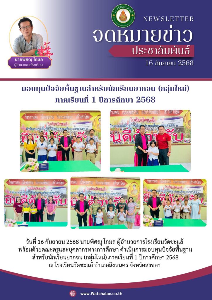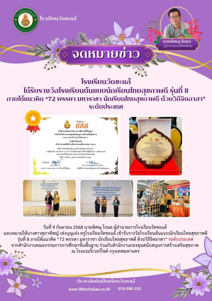 โรงเรียนวัดชะแล้ ได้รับรางวัลโรงเรียนต้นแบบนักเรียนไทยสุขภาพดี รุ่นที่ 8 ภายใต้แนวคิด “72 พรรษา มหาราชา นักเรียนไทยสุขภาพดี ด้วยวิถีจิตอาสา” ระดับประเทศ วันที่ 9 กันยายน 2568 นายพิศณุ โกมล ผู้อำนวยการโรงเรียนวัดชะแล้ มอบหมายให้นางสาวศุภาพิชญ์ เซ่งบุญเล่ง ครูโรงเรียนวัดชะแล้ เข้ารับรางวัลโรงเรียนต้นแบบนักเรียนไทยสุขภาพดี รุ่นที่ 8 ภายใต้แนวคิด “72 พรรษา มหาราชา นักเรียนไทยสุขภาพดี ด้วยวิถีจิตอาสา” ระดับประเทศ จากสำนักงานคณะกรรมการการศึกษาขั้นพื้นฐาน ร่วมกับสำนักงานกองทุนสนับสนุนการสร้างเสริมสุขภาพ ณ โรงแรมริเวอร์ไซด์ กรุงเทพมหานคร