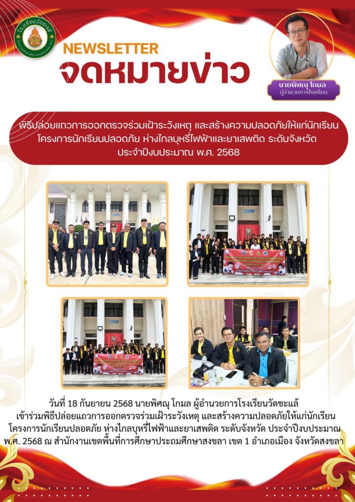 วันที่ 18 กันยายน 2568 นายพิศณุ โกมล ผู้อำนวยการโรงเรียนวัดชะแล้ เข้าร่วมพิธีปล่อยแถวการออกตรวจร่วมเฝ้าระวังเหตุ และสร้างความปลอดภัยให้แก่นักเรียน โครงการนักเรียนปลอดภัย ห่างไกลบุหรี่ไฟฟ้าและยาเสพติด ระดับจังหวัด ประจำปีงบประมาณ พ.ศ. 2568 ณ สำนักงานเขตพื้นที่การศึกษาประถมศึกษาสงขลา เขต 1 อำเภอเมือง จังหวัดสงขลา