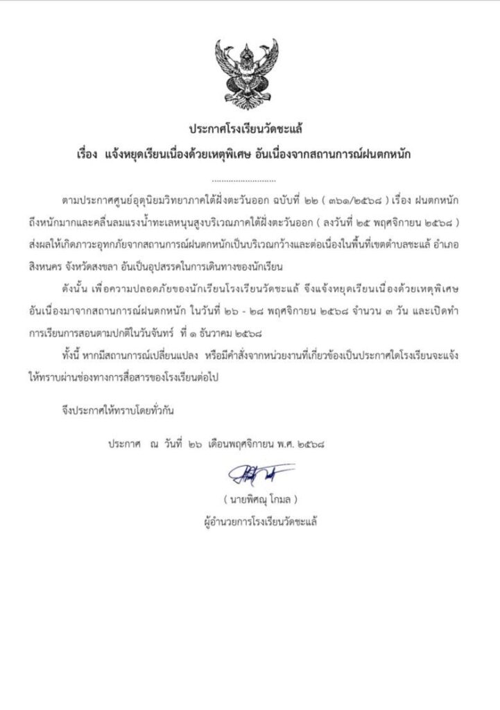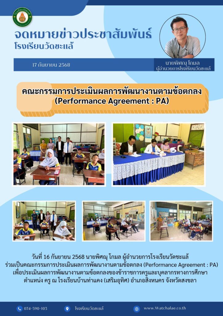 วันที่ 11 พฤศจิกายน 2568 นายพิศณุ โกมล ผู้อำนวยการโรงเรียนวัดชะแล้ พร้อมด้วยคณะครูและบุคลากรทางการศึกษา ให้การต้อนรับคณะนิเทศติดตามความพร้อมการเปิดภาคเรียนที่ 2 ปีการศึกษา 2568 จากสำนักงานเขตพื้นที่การศึกษาประถมศึกษาสงขลา เขต 1 เพื่อเป็นการเตรียมความพร้อมของสถานศึกษาในการนำนโยบายสู่การปฏิบัติ ณ โรงเรียนวัดชะแล้ อำเภอสิงหนคร จังหวัดสงขลา