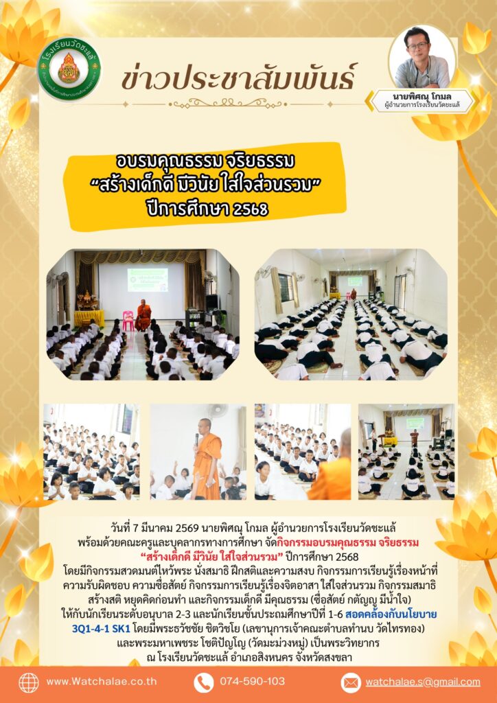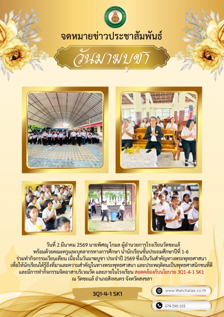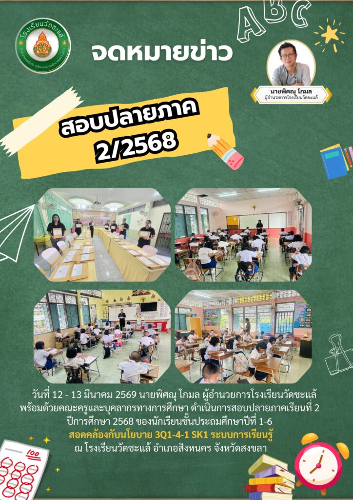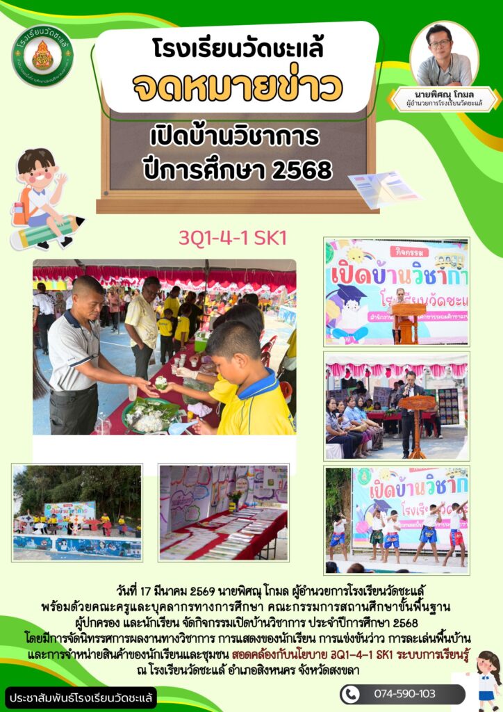 วันที่ 17 มีนาคม 2569 นายพิศณุ โกมล ผู้อำนวยการโรงเรียนวัดชะแล้ พร้อมด้วยคณะครูและบุคลากรทางการศึกษา คณะกรรมการสถานศึกษาขั้นพื้นฐาน ผู้ปกครอง และนักเรียน จัดกิจกรรมเปิดบ้านวิชาการ ประจำปีการศึกษา 2568 โดยมีการจัดนิทรรศการผลงานทางวิชาการ การแสดงของนักเรียน การแข่งขันว่าว การละเล่นพื้นบ้าน และการจำหน่ายสินค้าของนักเรียนและชุมชน สอดคล้องกับนโยบาย 3Q1-4-1 SK1 ระบบการเรียนรู้ณ โรงเรียนวัดชะแล้ อำเภอสิงหนคร จังหวัดสงขลา