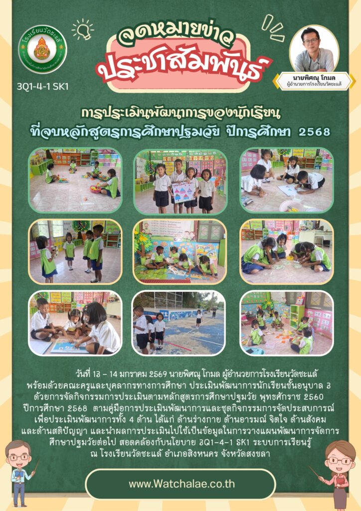 วันที่ 13 – 14 มกราคม 2569 นายพิศณุ โกมล ผู้อำนวยการโรงเรียนวัดชะแล้พร้อมด้วยคณะครูและบุคลากรทางการศึกษา ประเมินพัฒนาการนักเรียนชั้นอนุบาล 3 ด้วยการจัดกิจกรรมการประเมินตามหลักสูตรการศึกษาปฐมวัย พุทธศักราช 2560 ปีการศึกษา 2568 ตามคู่มือการประเมินพัฒนาการและชุดกิจกรรมการจัดประสบการณ์ เพื่อประเมินพัฒนาการทั้ง 4 ด้าน ได้แก่ ด้านร่างกาย ด้านอารมณ์ จิตใจ ด้านสังคมและด้านสติปัญญา และนำผลการประเมินไปใช้เป็นข้อมูลในการวางแผนพัฒนาการจัดการศึกษาปฐมวัยต่อไป สอดคล้องกับนโยบาย 3Q1-4-1 SK1 ระบบการเรียนรู้ ณ โรงเรียนวัดชะแล้ อำเภอสิงหนคร จังหวัดสงขลา